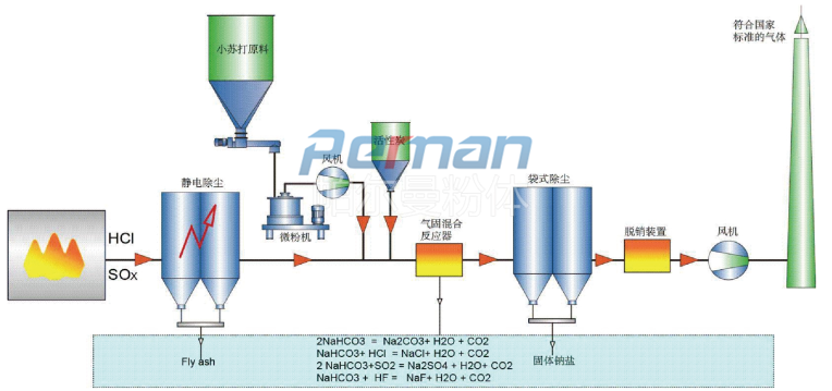煙氣中含有大量的酸性氣體,經(jīng)過大量的數(shù)據(jù)和實(shí)驗(yàn),只有碳酸氫鈉(小蘇打, NaHCO3)小到一定的程度,其才能和煙氣中的酸性成分產(chǎn)生最大效率的反應(yīng)。它通過化學(xué)吸附去除煙氣中的酸性污染物,同時(shí)還可通過物理吸附去除一些無(wú)機(jī)和有機(jī)微量物質(zhì)。此工藝將碳酸氫鈉細(xì)粉直接噴入高溫?zé)煔?。在高溫下碳酸氫鈉分解生成碳酸鈉Na2CO3、H2O和CO2。