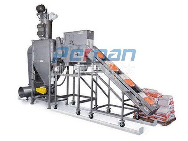 篩分裝置:篩分裝置中滾筒篩壁面布滿篩孔,篩板表面固定有可活動(dòng)的6塊斜板,此斜板起到內(nèi)螺旋的作用。廢袋和物料進(jìn)入滾筒篩內(nèi),滾筒篩低速旋轉(zhuǎn),加速物料透過篩孔落入錐斗內(nèi),廢袋由滾筒篩內(nèi)螺旋輸送到滾筒出口,并掉落到廢袋輸送機(jī)內(nèi)。